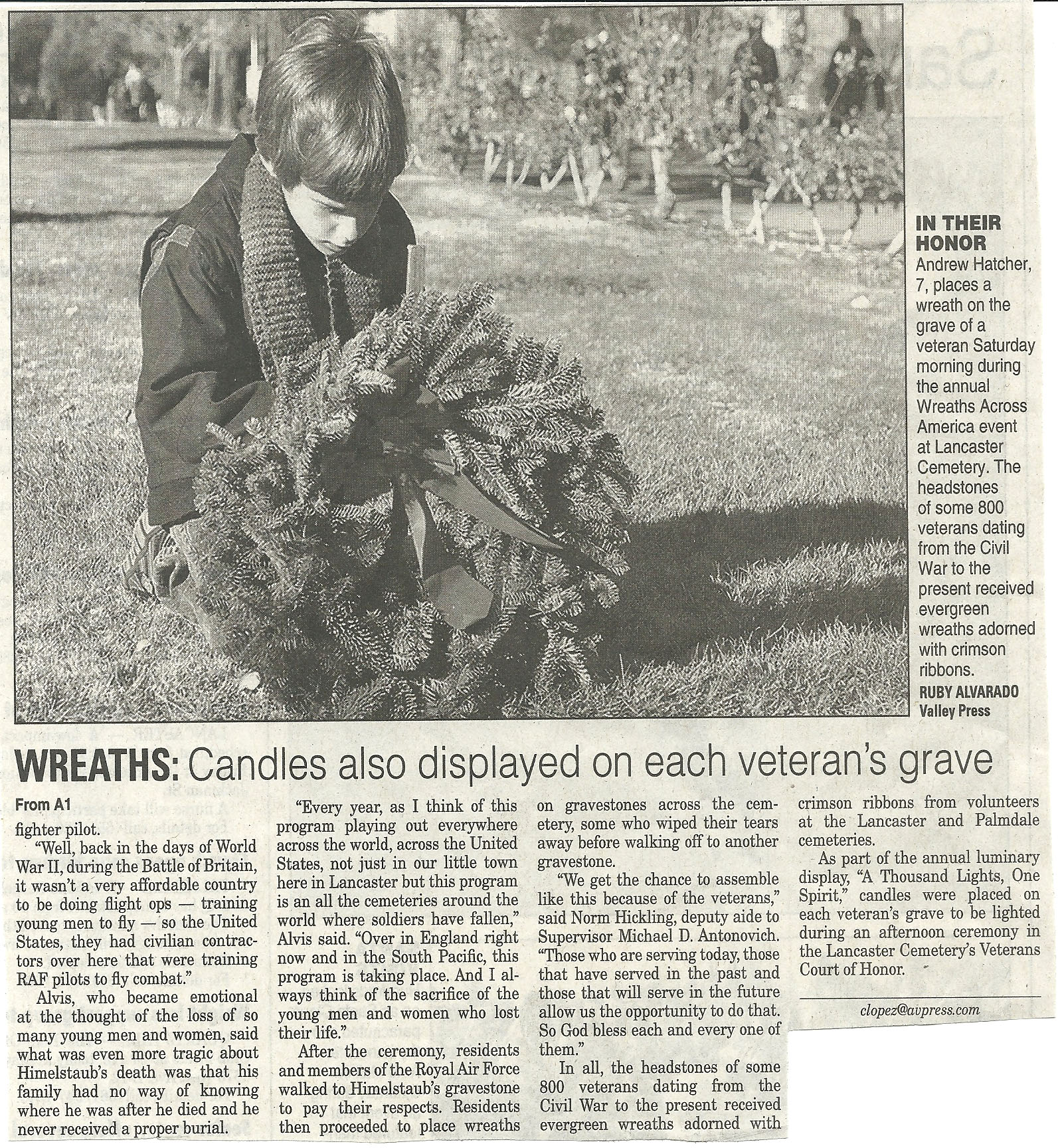 Dusty Oliver, 15, of Littlerock, lights a luminary at the gravesite of a military veteran in Lancaster Cemetery, Dec. 14. The evening lighting was spearheaded by Lancaster City Councilman, Ken Mann, who has sponsored the event for many years in honor of his late father, Clifford Mann, a World War II veteran and B-17 pilot.