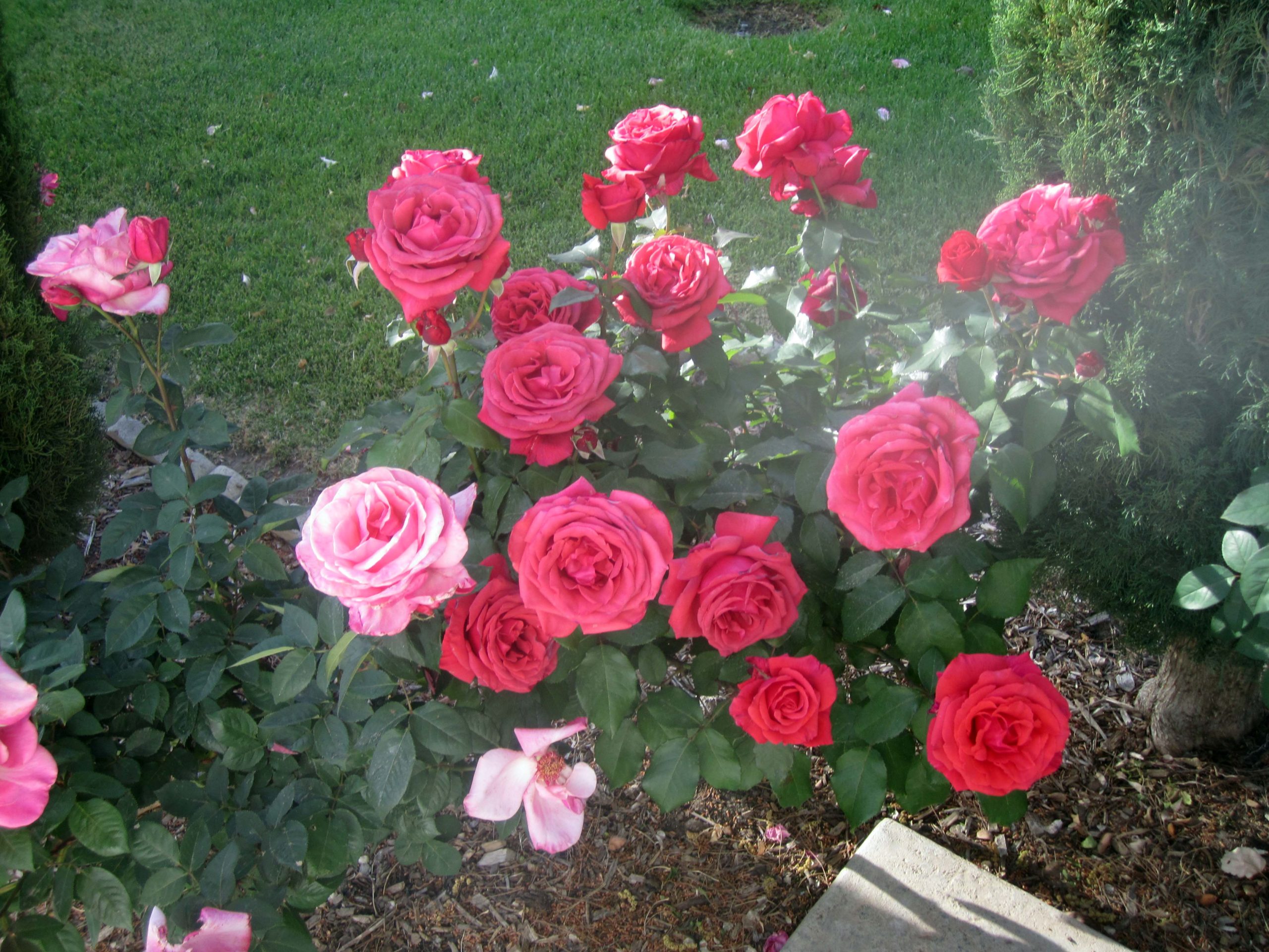 Picture of pink rose bush by a building at Lancaster Cemetery