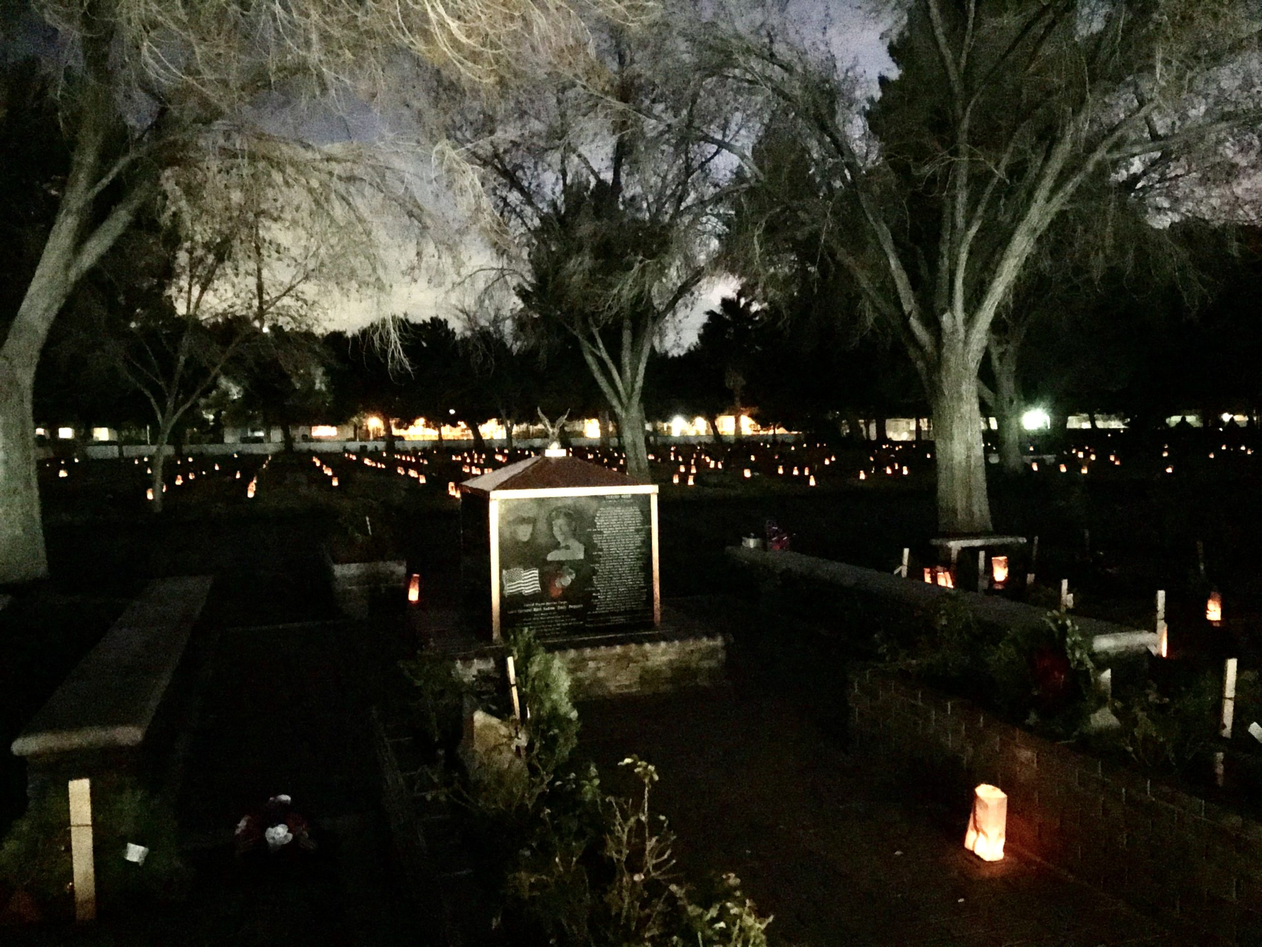 Luminaries adorn the graves of nearly 1,000 veterans buried at Lancaster Cemetery in Lancaster, Calif., Dec. 14. The candlelight display was part of a ceremony in conjunction with Wreaths Across America that remembers the fallen and honors those who served in the military. The evening lighting was spearheaded by Lancaster City Councilman, Ken Mann, who has sponsored the event for many years in honor of his late father, Clifford Mann, a World War II veteran and B-17 pilot. For more photographs from the ceremony