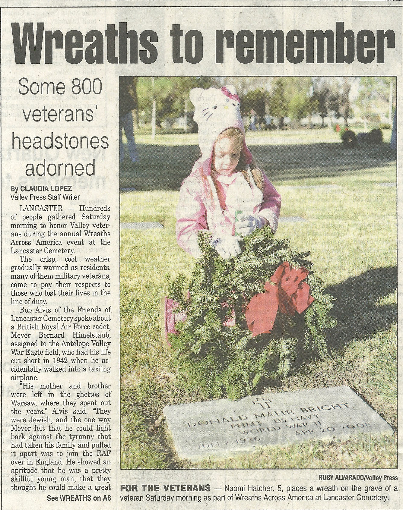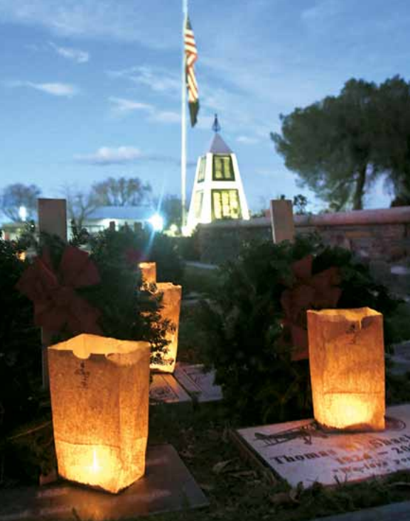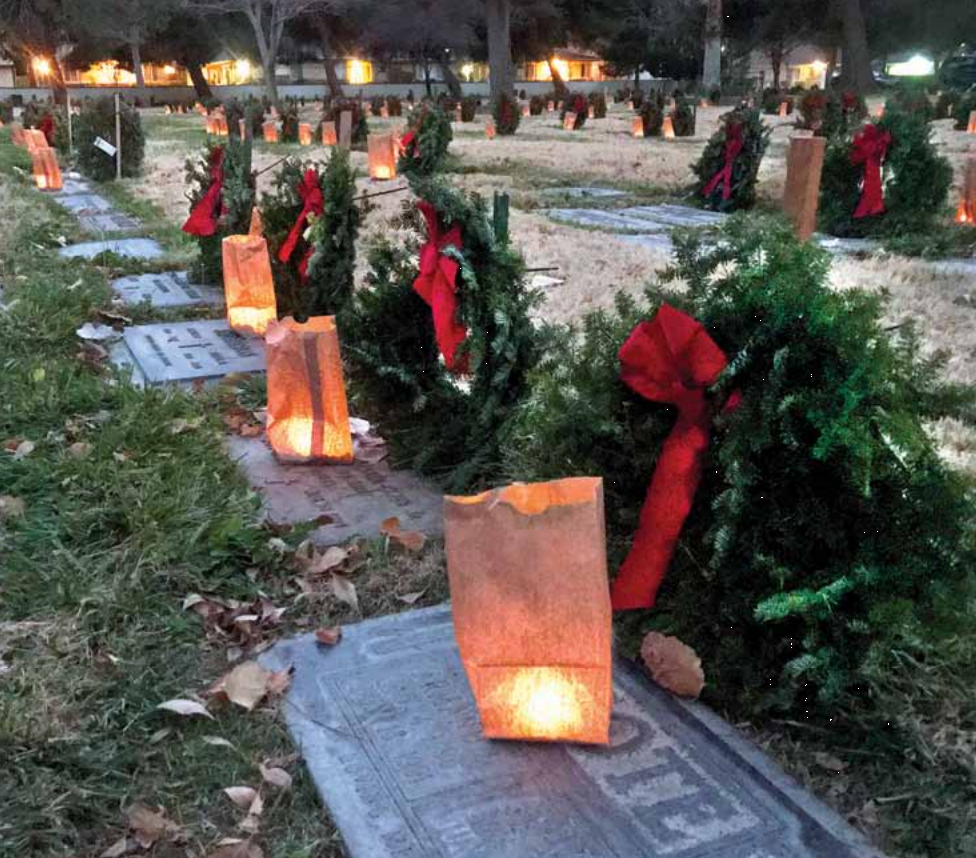 Luminaries adorn the graves of nearly 1,000 veterans buried at Lancaster Cemetery in Lancaster, Calif., Dec. 14. The candlelight display was part of a ceremony in conjunction with Wreaths Across America that remembers the fallen and honors those who served in the military. The evening lighting was spearheaded by Lancaster City Councilman, Ken Mann, who has sponsored the event for many years in honor of his late father, Clifford Mann, a World War II veteran and B-17 pilot. For more photographs from the ceremony