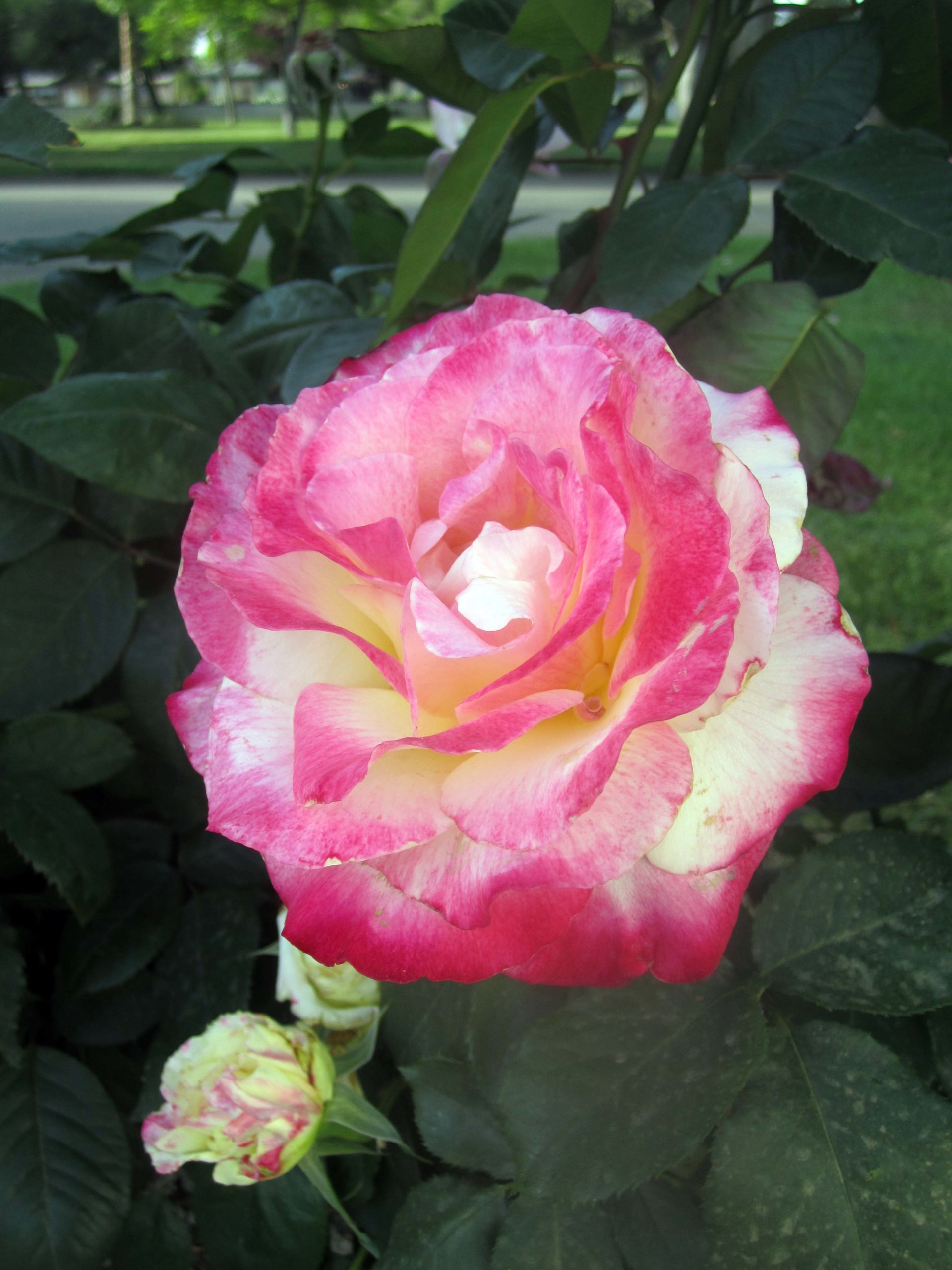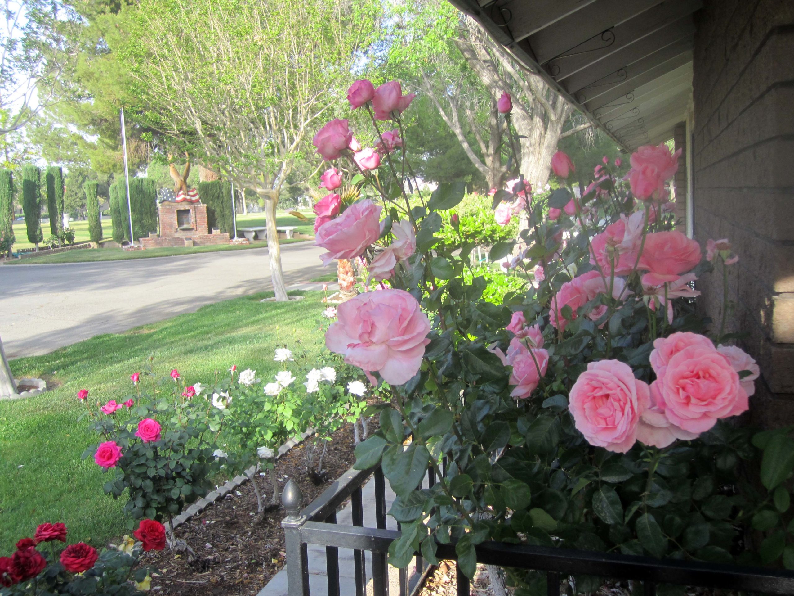 Picture of pink rose bush by a building at Lancaster Cemetery